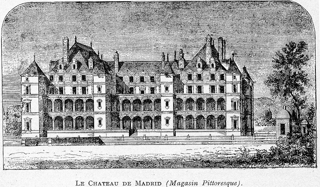 El nom Madrid, però, podria tenir un altre origen, tal com va informar, entre d'altres, l'historiador Sauval. El reiFrancesc I es va escapar discretament al Château de Boulogne, construït just després de tornar de la captivitat a Madrid després de la derrota de Pavia, i els cortesans van agafar l'hà bit, amb burla, de dir, quan ja no veien el sobirà , que era a Madrid[3]. La seva decoració de rajoles esmaltades, a l'estil dels azulejos espanyols, també afavoreix aquest nom. A poc a poc, el Château de Boulogne va prendre el nom de Madrid, com indica Androuet du Cerceau a les seves elevacions: Boulongne dit Madril.