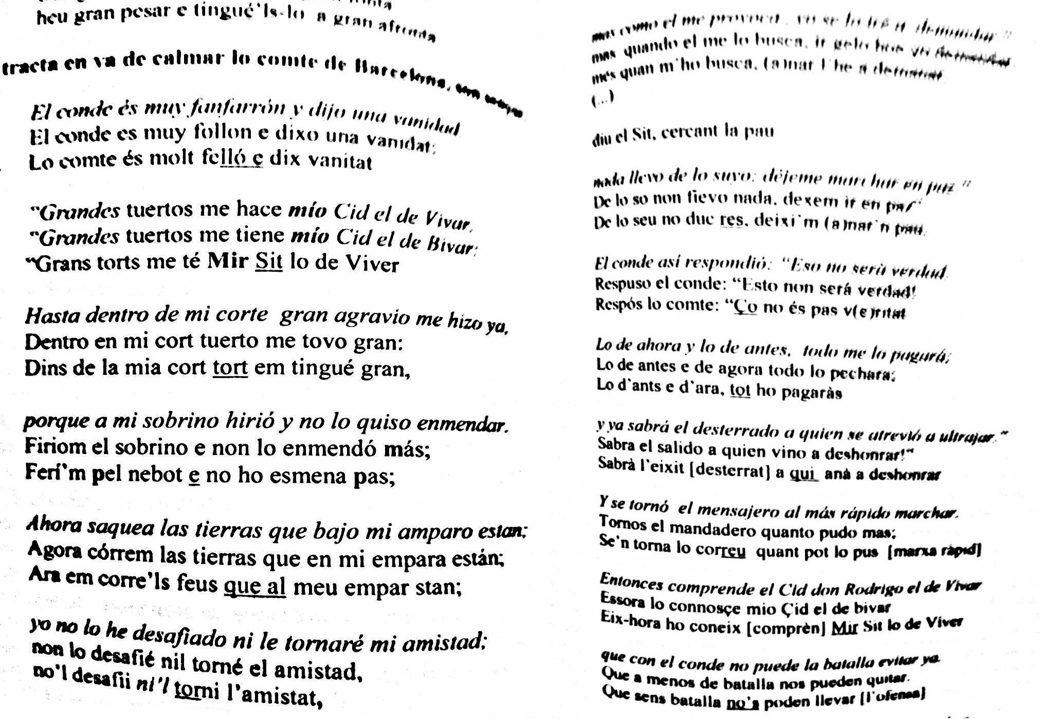 CastellĂ modern: "Grandes tuertos me hace mĂo Cid el de Vivear" CastellĂ antic: "Grandes tuertos me tiene mĂo Cid el de Bivar" CatalĂ medieval reconstruĂŻt: Grans torts me tĂ© Meu Sit lo de Viver