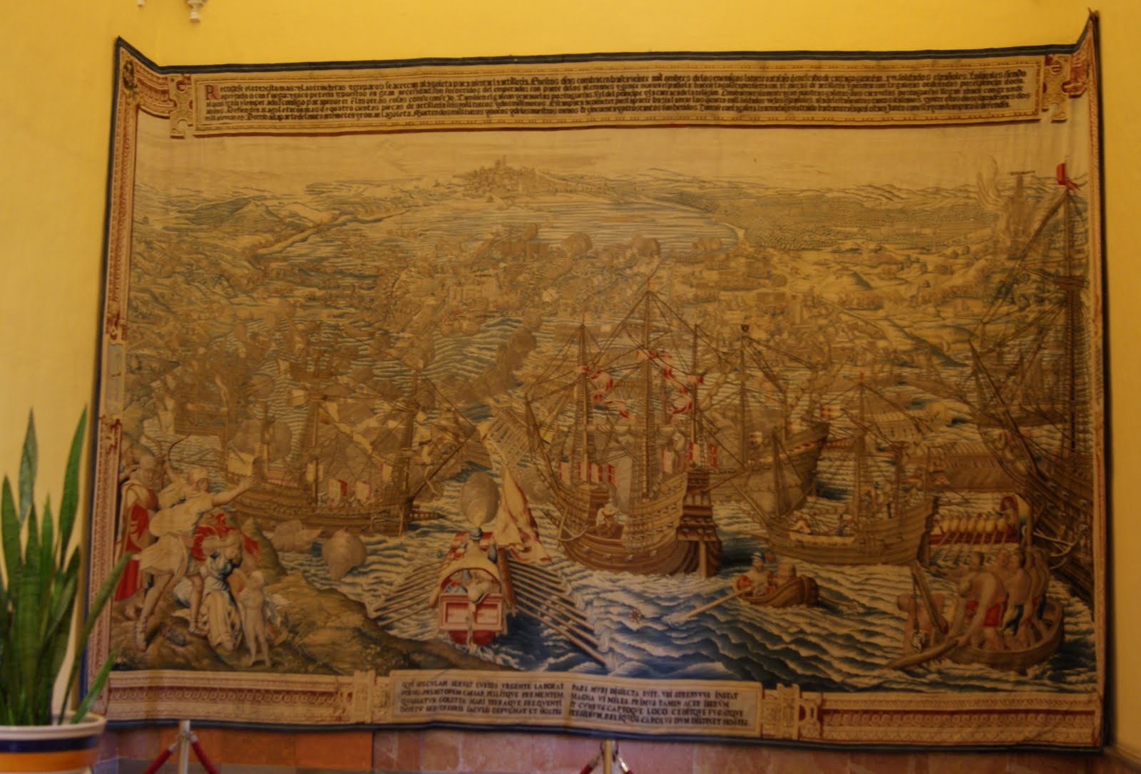 Es tracta d'una sèrie de tapissos representant la conquesta de Tunis el 1535 per l'emperador Carles V, els originals, perduts, eren d'origen flamenc, teixits (amb fils d'or i plata) el 1546 per Francisco i Cornelio Van der Gotte, del taller de Willem Pannemaker per encàrrec de la regent Maria d'Hongria, germana de l'emperador. La intenció de la sèrie era mostrar a l'emperador Carles V com l'heroi militar de la cristiandat enfront del amenaçador imperi turc. La col·lecció va estar exposada a Londres el 1554, amb motiu del matrimoni entre el príncep hereu Felip i la reina Maria Tudor. VERSIÓ OFICIAL: Al segle XVIII els originals estaven tan "danyats" que Felip V va encarregar el 1740 les còpies en seda i llana que es conserven avui dia entre Madrid i Sevilla.